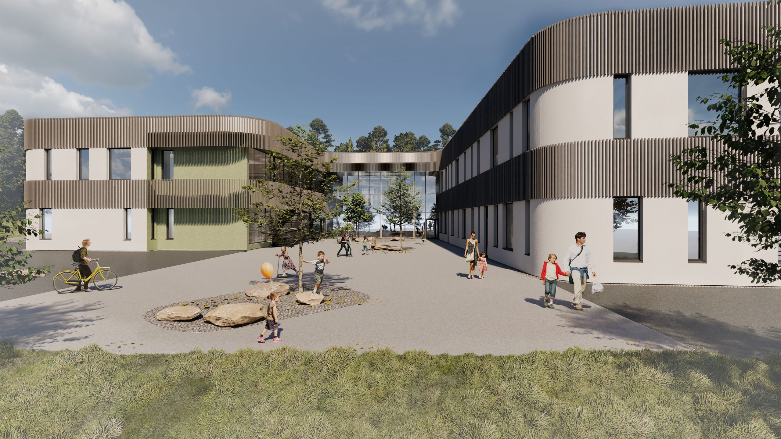 De interne rommene er utformet med utstrakt bruk av eksponert massivtre. Dette gir lune og behagelige læringsarealer, samt at treets hygrotermiske og hygroskopiske egenskaper bidrar til et stabilt inneklima. Store vinduer gir ekstra godt dagslys og nærhet til naturlandskapet. De interne rommene stimulerer sanser og vekker følelser. Dette er rom som legger til rette for mangfold, tilgjengelighet, utfoldelse og læring.