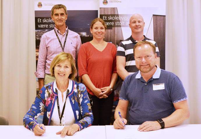 Undervisningsbygg og Klima og Bygg AS signerte i går kontrakt på 105 millioner kroner for rehabilitering av Holmlia skole. Skolen skal stå ferdig sommeren 2020.